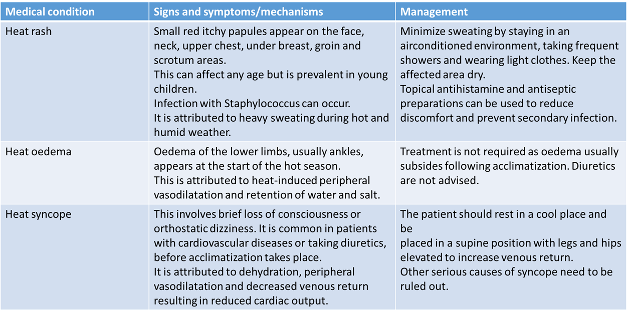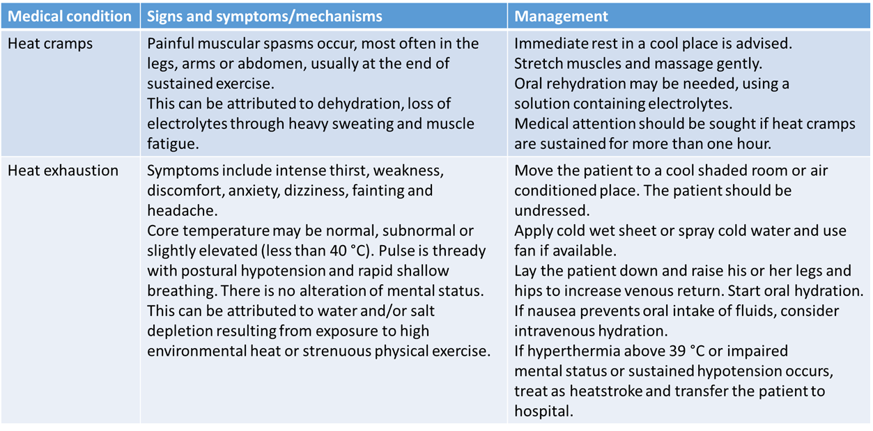 Management of mild/moderate heat-related illnesses: